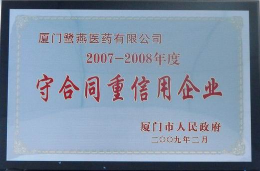 近日,廈門鷺燕醫藥有限公司、廈門鷺燕大藥房有限公司在廈門市工商行政管理局組織的 “廈門市2007—2008年度‘守合同,重信用’”評比活動中榜上有名,這是鷺燕集團旗下子公司繼05-06年度之后再次獲此殊榮。
